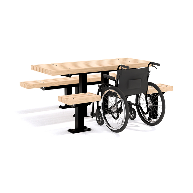 The Accessible Picnic Table offers inclusive outdoor seating for everyone. Featuring an extended tabletop and open spaces to easily accommodate wheelchairs, this table is built with durable timber slats, a strong steel frame for lasting use and ensures accessibility and enjoyment for all users.