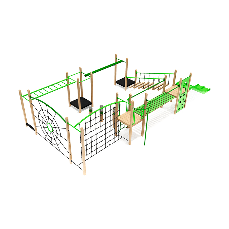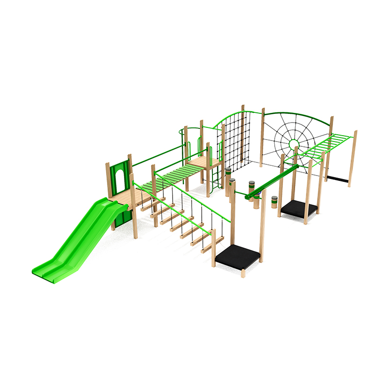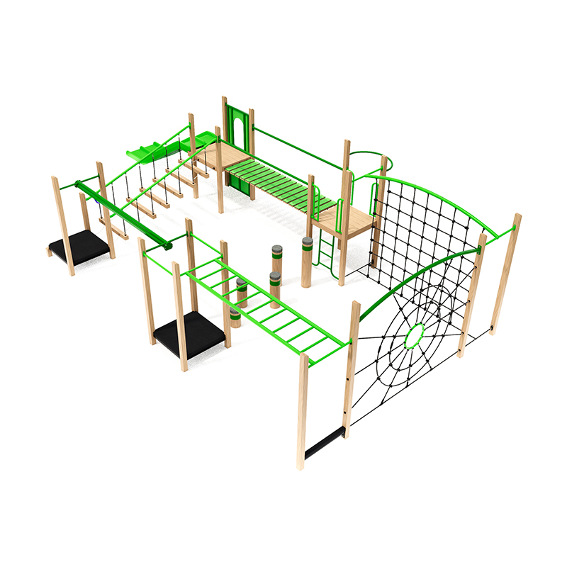 The Methven junior structure is a flagship multi-play system designed to be the ultimate adventure circuit for junior and intermediate users. This unit features a diverse range of high-value play elements, including a spider web climbing net, overhead ladder for upper body strength, and a double slide for side-by-side racing fun. With its interconnected bridges and varied traverse lines, the Methven creates a continuous flow of movement that keeps children engaged and active.