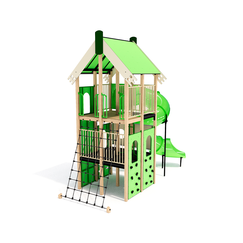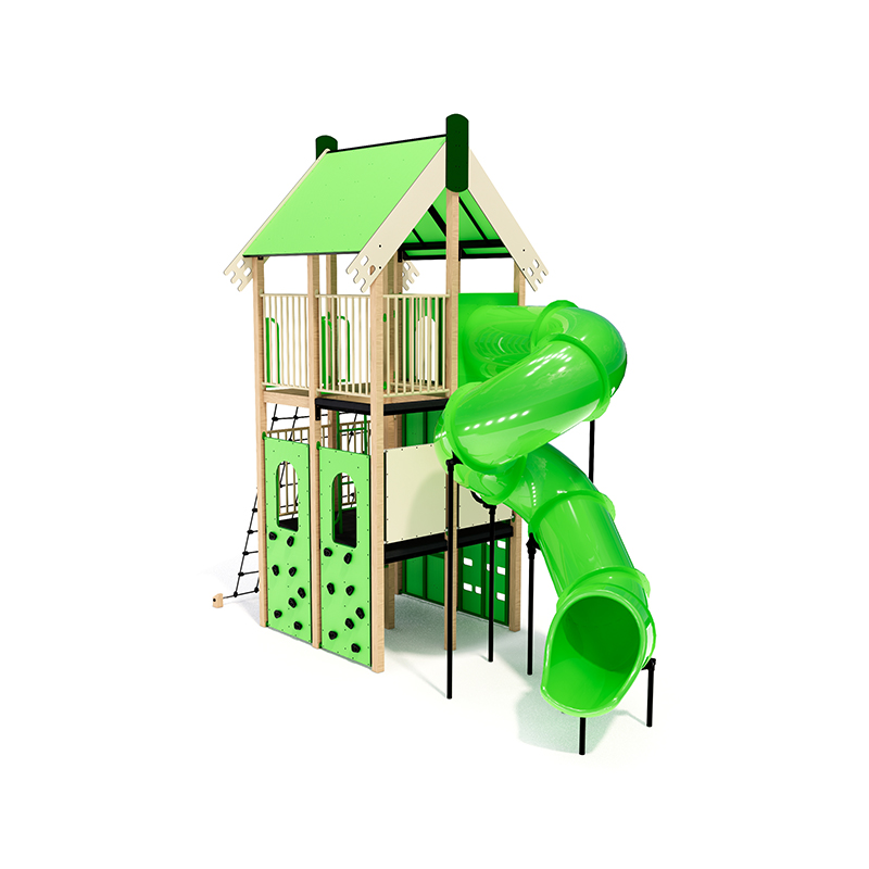 Looking for a playground landmark? The Two Storey Whare is an impressive structure that invites children into a world of vertical exploration. Whether they’re scaling the rock walls, navigating the cargo net, or gathering in the upper-level lookout, this whare fort offers a sense of discovery and community. The highlight of this piece is the twisting spiral slide, which sends children spinning back to ground level, ready to start the climb all over again. It’s a perfect base for imaginative role-play, teamwork, and active outdoor fun.